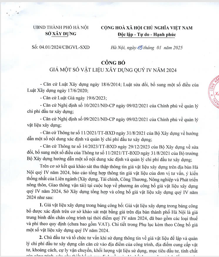Ngày 15/01/2025, Liên Sở Xây dựng – Tài chính Thành phố Hà Nội ban hành Công bố số 04.01/2024/CBGVL-SXD. Về việc công bố giá vật liệu xây dựng quý 4 năm 2024 trên địa bàn Thành phố Hà Nội.